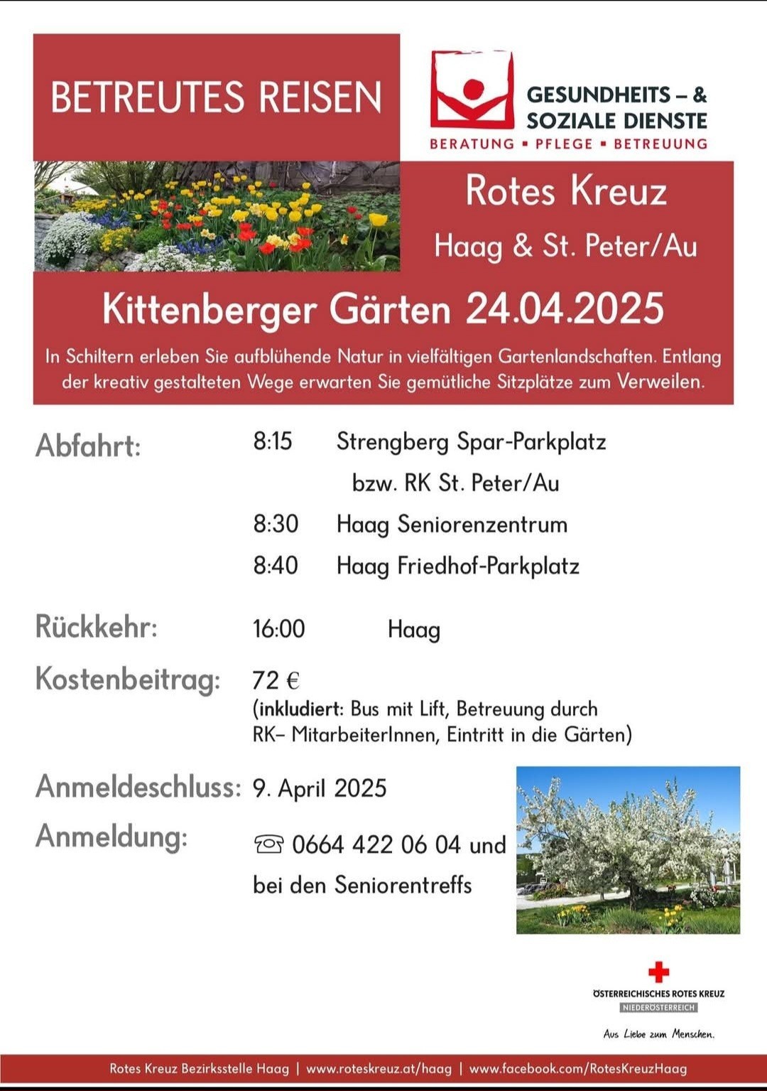 Kosten: € 72,-- (inkludiert: Bus mit Lift, Betreuung durch RK-MitarbeiterInnen, Eintritt in die Gärten)