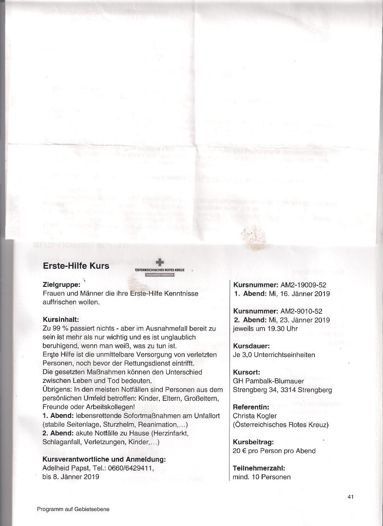Für alle Frauen und Männer, die ihre Erste-Hilfe Kenntnisse auffrischen wollen, organisieren die Bäuerinnen Strengberg im Jänner 2019 einen aus zwei Abenden bestehenden Erste-Hilfe Kurs in Strengberg. Erste Hilfe ist die unmittelbare Versorgung von verletzten Personen, noch bevor der Rettungsdienst eintrifft. Die gesetzten Maßnahmen können dabei den Unterschied zwischen Leben und Tod bedeuten - daher ist es mehr als wichtig, im Ausnahmefall bereit zu sein.